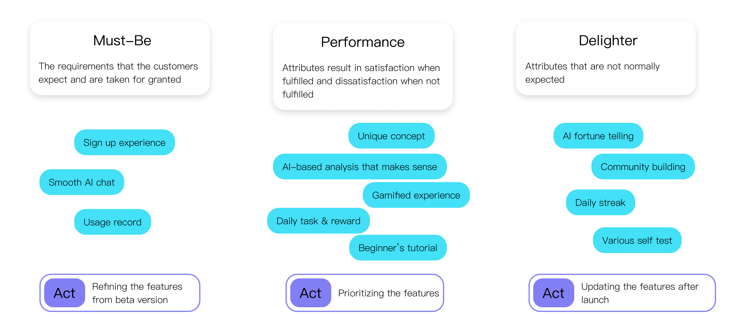 Kano Model is employed in the design process to decide the priority of features and well as effectively arranging energy and time in team work. By using Kano model, we separate the tasks into three part: Must-be, Performace, and Delighter and take different actions for each kind.