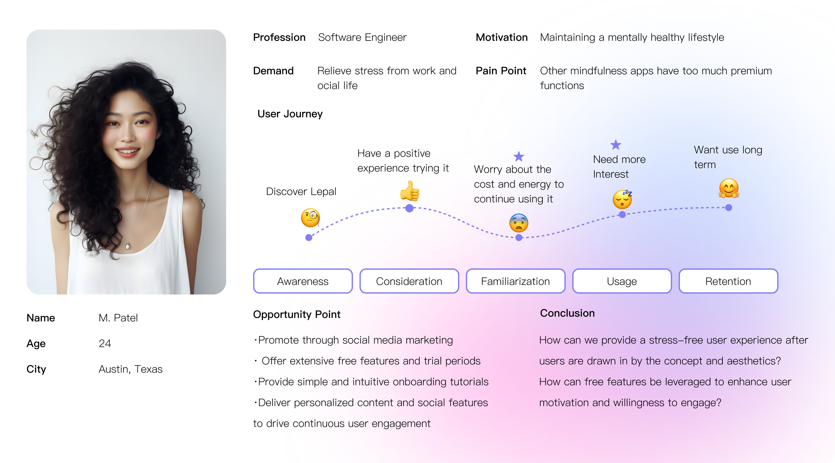 Lepal.ai is a gamified product aims at improving positivity of Gen-Z users. By creating an AI companion and providing a mental oasis, it helps users to focus on self-healing and relaxing through a series of interactive exercises.
