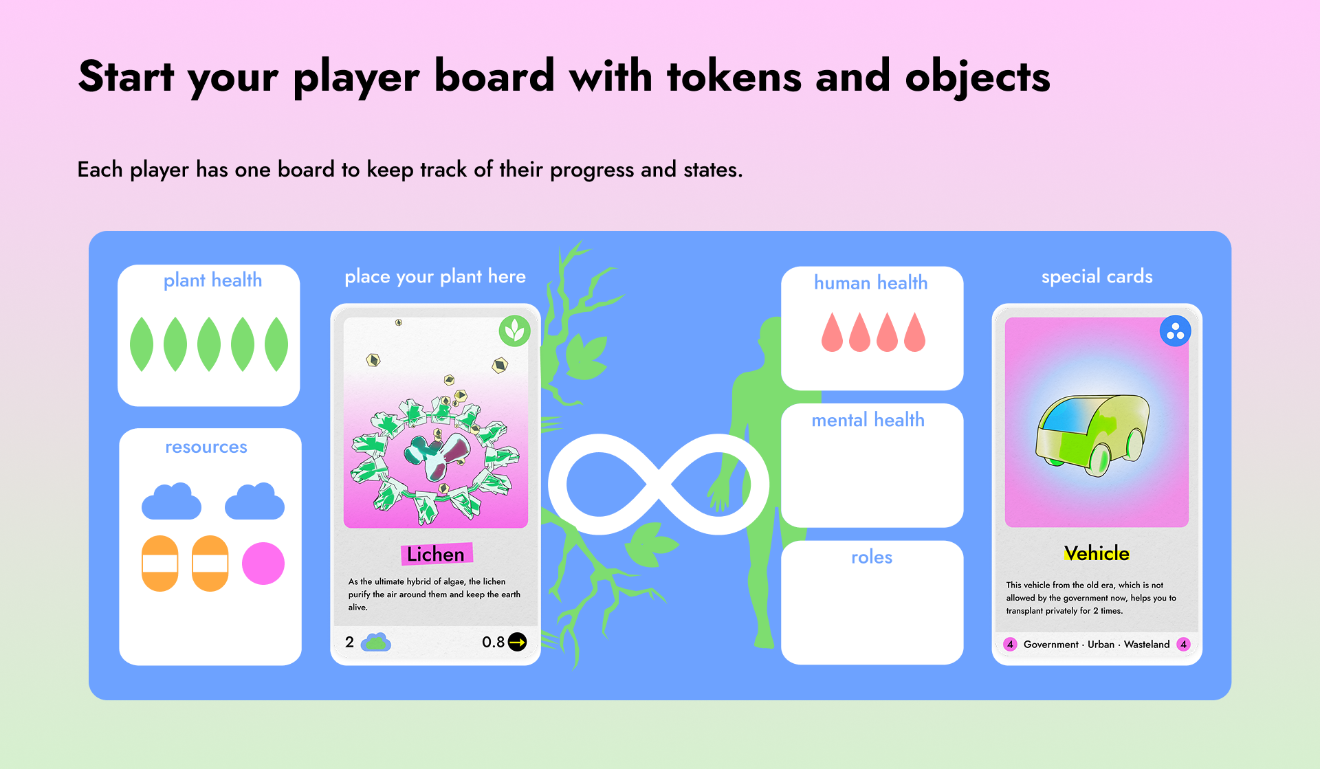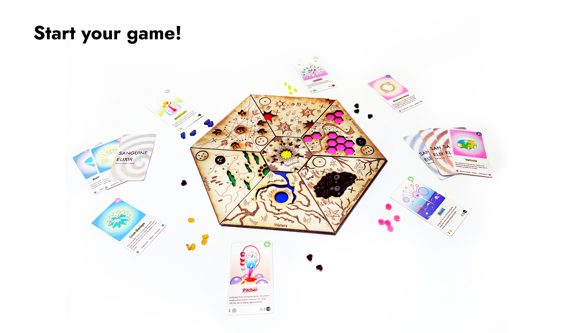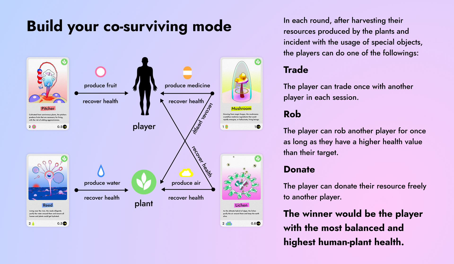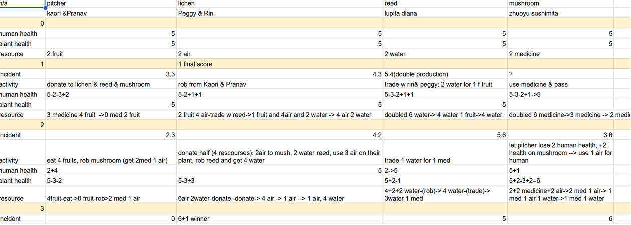 Designed for 2-4 players, the game simulates survival through plant-human partnerships: each player begins with a plant, resources, and a socio-natural context that determines their pathways forward. Progress requires solving individual challenges through strategic use of capabilities, alliances, and networks. The gameplay unfolds through moments of transition, like forming survival strategies, and narrative-building exercises where players co-create hidden layers of the world. This process transforms the game into a collective act of speculation, discussion, and storytelling.